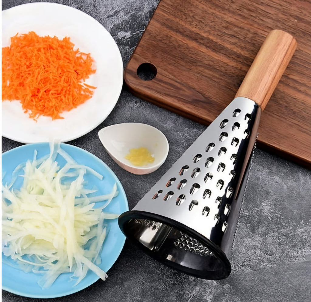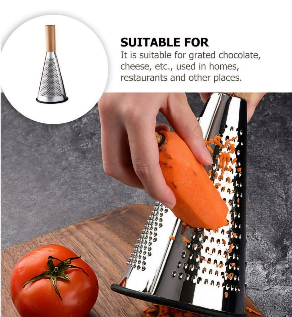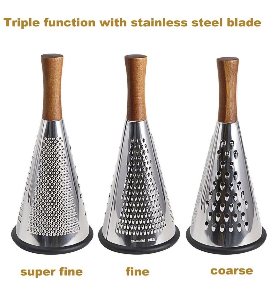 Triple function. Wooden handle. Rubber non slip bottom. Can be used on a variety of cheeses, chocolates, vegetables, fruits, etc.