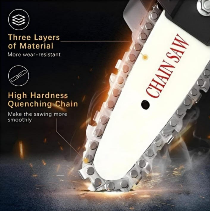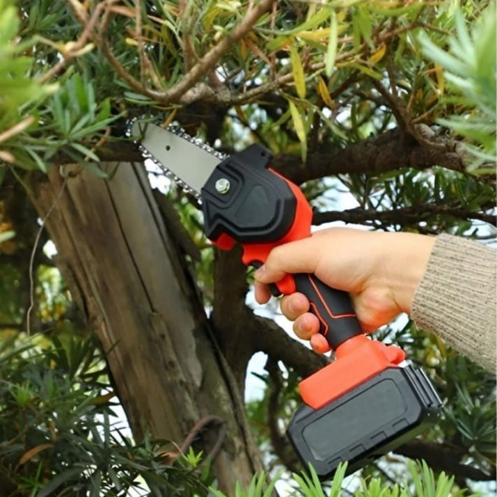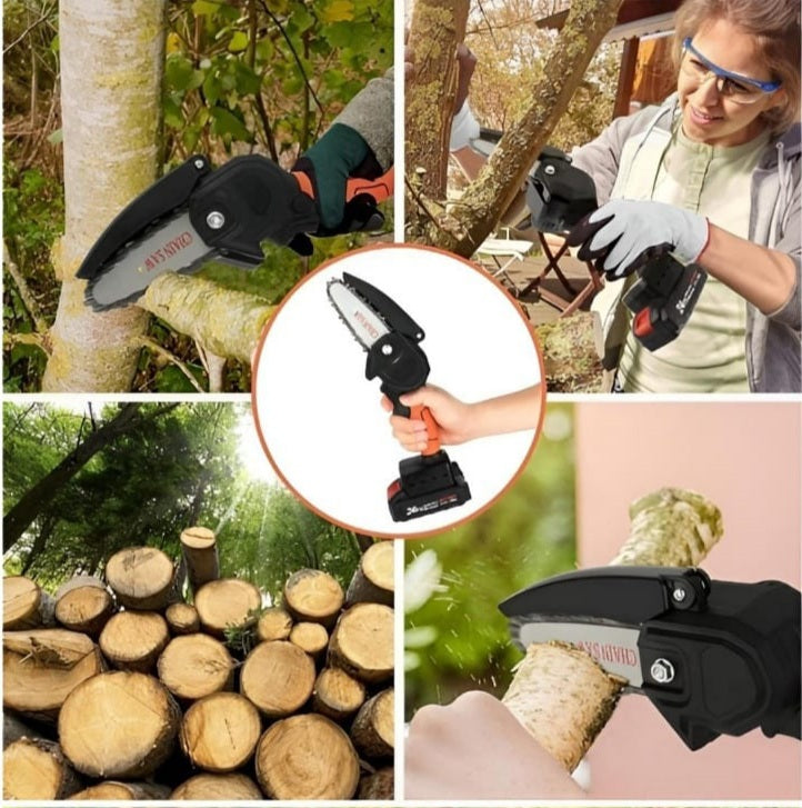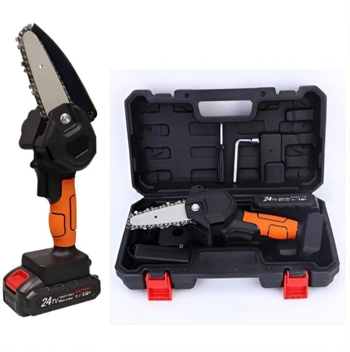 24V. Lightweight mini chainsaw that is easy to handle with one hand. 1-2 Hours working time. Carry case included.