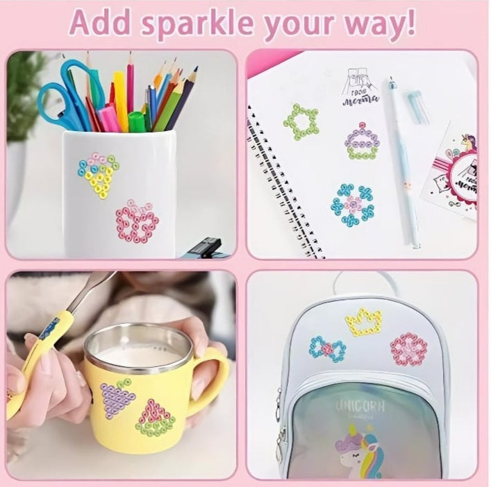 You can use this shining diamond stamper to design any unique fashion dazzling look you want on your hair, nails, clothes, hats, shoes, bags, phone case, postcards, etc. Contains 1 diamond pen machine, 30 gem stickers, 6 additional diamonds, 1000 rhinestones in all.