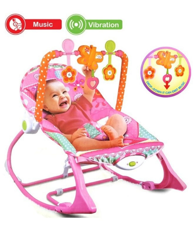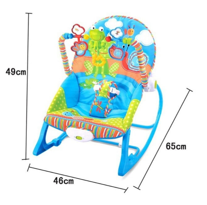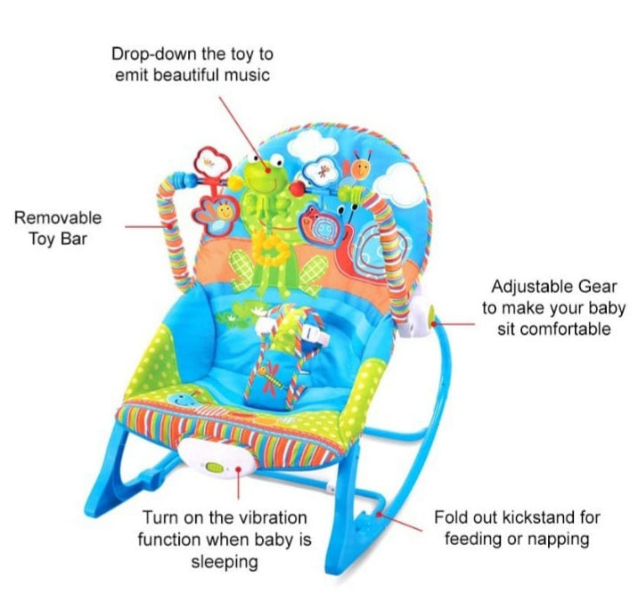 Soothing vibration and music. Easily converts to a toddler rocker. Machine washable pad. Frame extends to higher position for toddler rocker or stationery seat. Maximum weight of child for rocker 18kg. Require LR20 1.5V Alkaline Battery x 1 (Not Inlcuded)