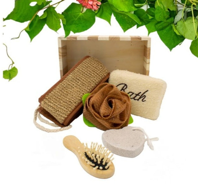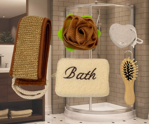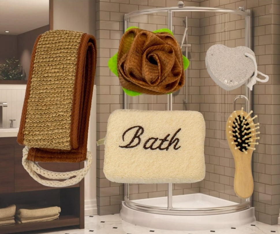 Time to treat yourself to a relaxing spa and massage day at the comfort of your home with this bath set. Set Includes: Loofah back towel, Bath sponge, Flower shaped bath scrunchie, Pumice stone, Massage brush.