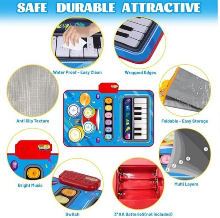 The toddler musical toys are great to develop baby's musical interest, improve hand and feet coordination skills, fostering creativity, and promoting exercise at an early age. The piano side has 6 kinds of instrument sounds (piano, violin, vibraphone, trumpet, accordion, guitar) and 8 keys. The drum side has 2 sticks for 3 year old boys and girls enjoy playing the drum set. Size 80x50cm.