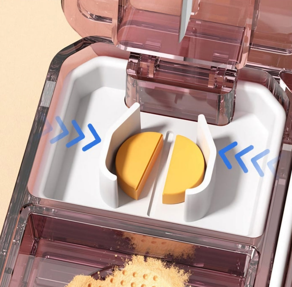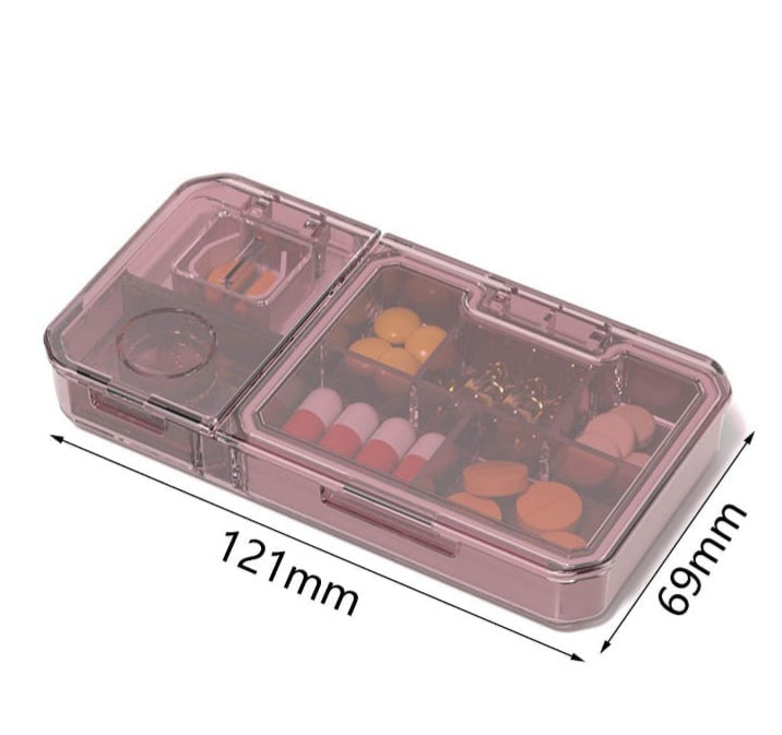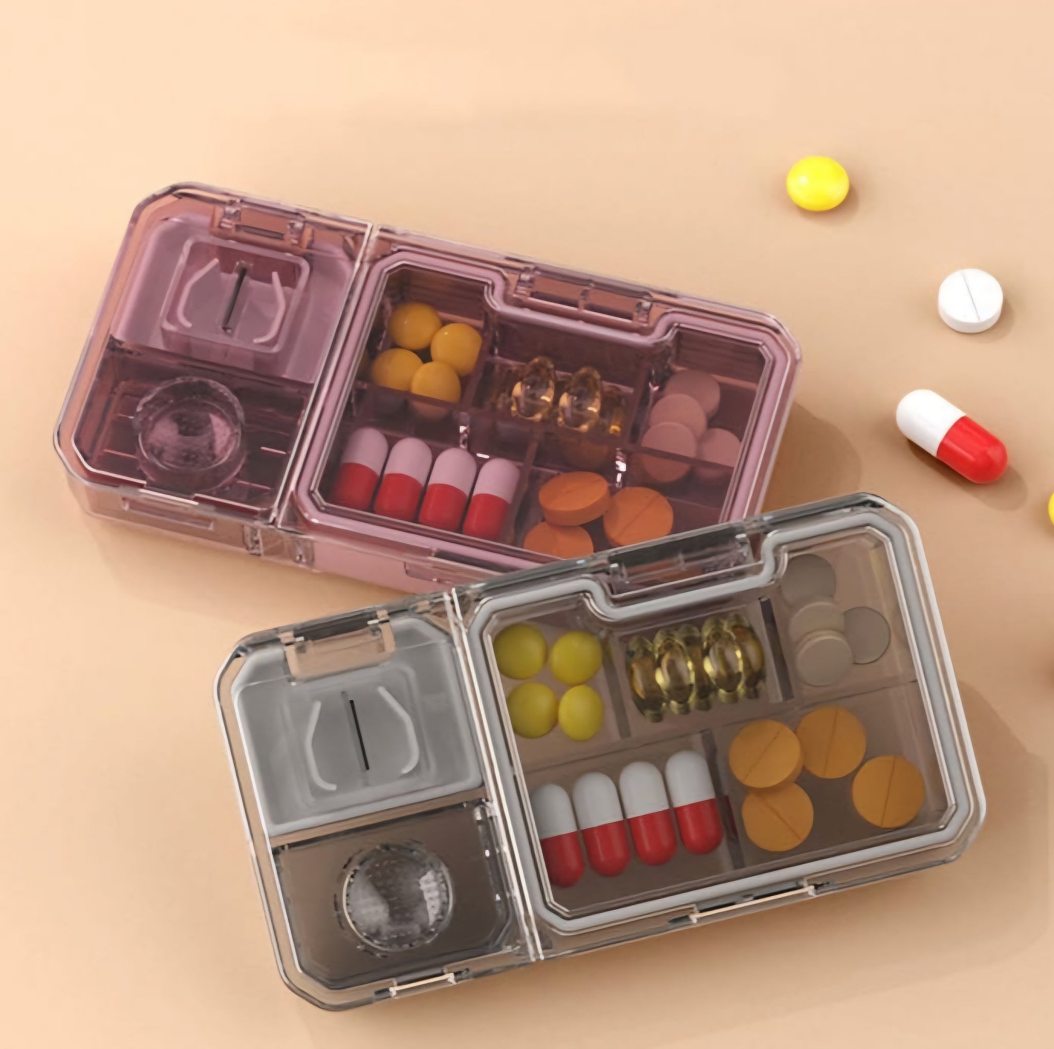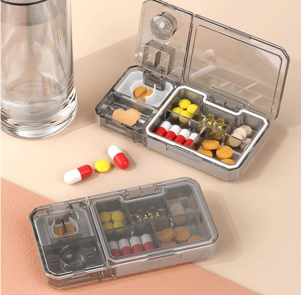 Distribute and organize your daily medication with ease and simplicity. Stainless steel cutter for cutting pills. Random colour.