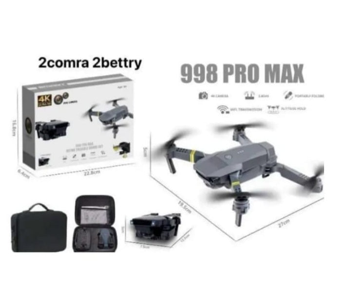 Drone 998Pro Dual Battry Dual Camera 2.4GHz. Equipped with state-of-the-art stabilization technology, the drone ensures smooth and steady footage. Even in challenging flying conditions, the dual camera system is ideal for capturing cinematic shots and conducting precise aerial inspections. Charging Time: 60-70 minutes. Remote control distance: 80 meters approx. Package weight: 0.435g. Includes 2 batteries and all required accessories.