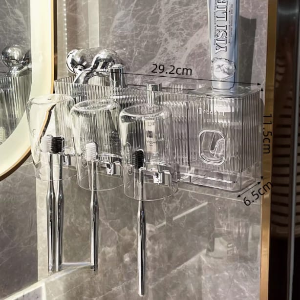 Multi-functional toothbrush holder with combination of toothpaste dispenser, cups for mouthwash and holders for additional accessories.